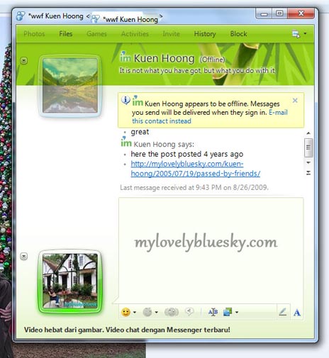 马来西亚 2009年8月26日星期三 今天是农历七月初七,也是华人庆祝的七夕节。没有想过要如何庆祝,只想呆在家里。我坐在客厅上网,他坐在工作室,突然间我收到了他的MSN。 Kuen Hoong says: here the post posted 4 years ago 按一按link去看看,看到了他四年前写的文章〈网友=过客〉,过去权雄曾在friendster写blog,我竟然遗漏了这一篇不曾看过。如今,权雄打算重新写部落,他在mylovelybluesky.com设多了一个网页 http://kuenhoong.com/ … [Read more...] about 七夕节:他送给我的礼物