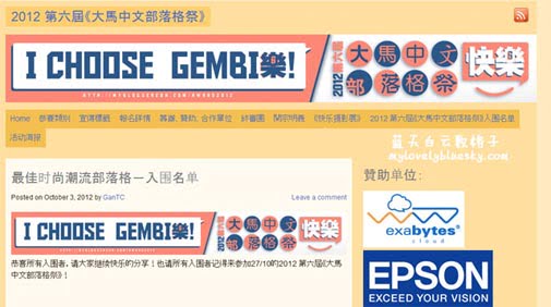 恭喜您入围2012第六届《大马中文部落格祭》的最佳时尚潮流部落格,更详细的名单在此,敬请留意。