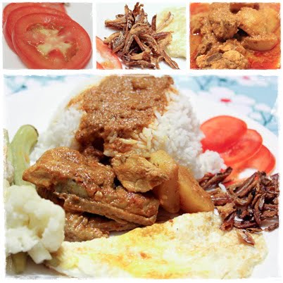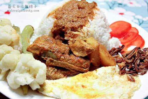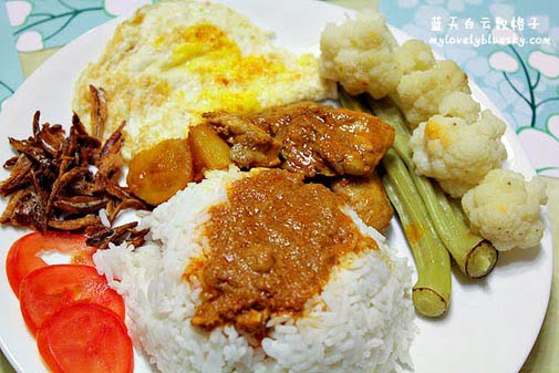想到咖哩鸡,我就想到Nasi Lemak Ayam,可是我又怕吃太肥,煮了白饭就好,没有椰浆的椰浆鸡饭。哈哈!!