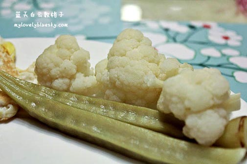 准备其它配料,煲饭蒸羊角豆,水煮菜花(加少许盐和油)