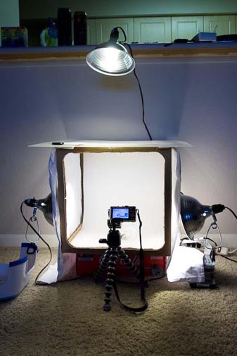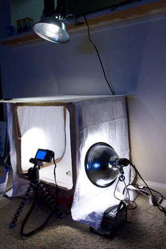 If too complicated, you can try the first attempt.. just cut the box, then cover it by white cloth. Without those light also can, those light is only used to make the object brighter or to creates more dynamic lighting effect.