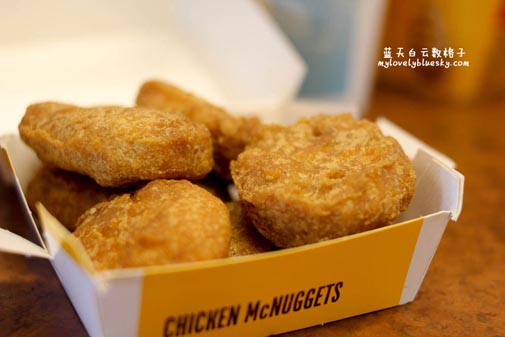 麦当劳无骨鸡肉块(Chicken McNuggets)6块,比起肯德基的无骨鸡肉块来硬。我本身比较喜欢吃肯德基的无骨鸡肉块,多了香料的味道。麦当劳的无骨鸡肉块淡无味。
