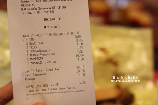 当时,我点了3分麦当劳套餐和2分McDonald’s Prosperity Burger套餐。3分麦当劳套餐的饮料改成咖啡,而McDonald’s Prosperity Burger的套餐里饮料保持,大哥一家人比较迟过来,他们另下订单。这5份套餐花了RM58.15,吃快餐也不便宜。