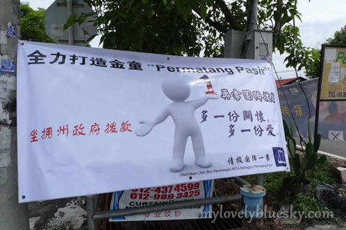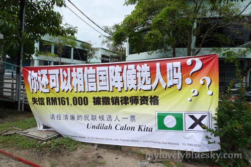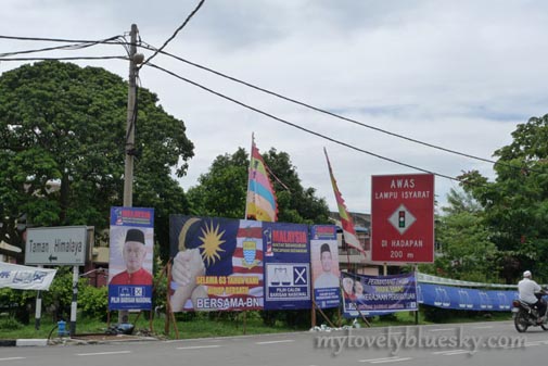 说真的,我看到这些布条写的口号,我偷偷笑!!一个讲发展,一个讲亲民。对我来说,过去20年来,不管是哪一个政党执政都好,这里也没有看到什么发展!!只有看到大选的时候,州议员和国会议员才出现在选区!!因此,我想说我要的是能做事的州议员,不是大选的时候出来开口头支票的人。