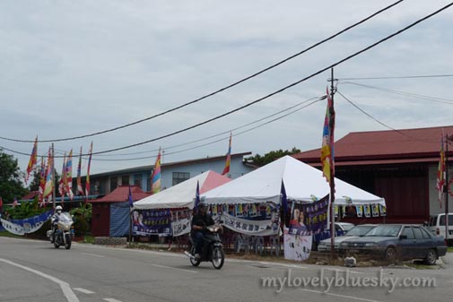 刚好现在是农历7月,我们可以看到盂兰盛会的旗帜在飘扬,还有补选的党旗也加入一起飘扬。