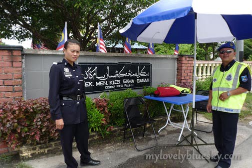 我来到了Sekolah Menengah Kebangsaan Sama Gagah投票。这是当地一间中学。这也是我第二次来投票。警察先生问我:你是哪一家报馆的记者?哈哈!!
