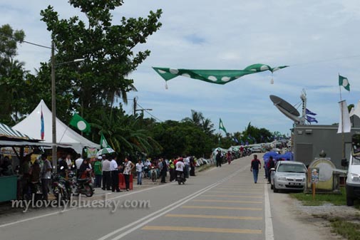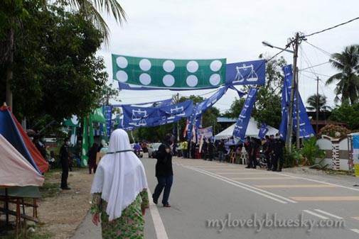 大概中午12点,我,爸爸,妈妈和大伯母4人一起前往投票中心。一路上,可以看到回教党和国阵的旗帜在飘扬。可以看得出这里的选民以马来人居多。 Permatang Pasir州议席选区共有2万290名合格选民,当中有1万4677人是马来人、5248名华人、332名印度人及33名其他种族。