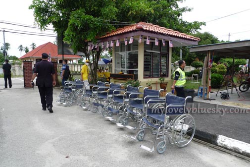 学校的门口摆放了一些轮椅,让有需要的人备用。