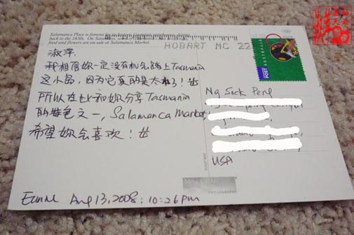 来了美国之后,在multiply里认识Eunice,和她总是无所不谈,可能我们都是身在异乡的马来西亚人吧!!之前,她向我拿了地址,也没有告诉做什么。原来她静悄悄从澳洲寄了一张明信片给我。