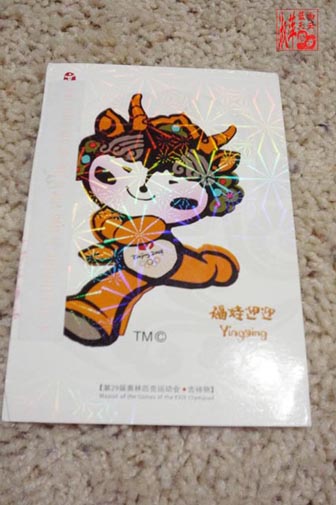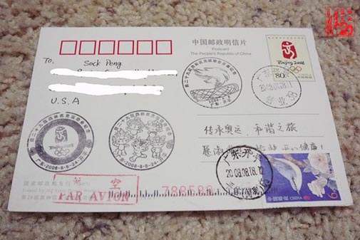 她知道我有收集明信片习惯,告诉我要给一个很特别的明信片,那就是第29届奥运会明信片。其实,我不知道奥运会有推出明信片,是不是井底之蛙?中国为了纪念主办第29届奥运会推出了《第29届奥林匹克运动会会徽和吉祥物》系列邮资明信片,包含了国际资费和国内资费明信片品种共4套,分别为《第29届奥林匹克运动会会徽》(国际资费)、《第29届奥林匹克运动会吉祥物》(普通型和光栅型)以及《第29届奥林匹克运动会会徽和吉祥物》邮资明信片等。