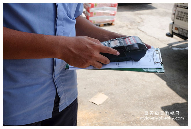他根据订单下货,然后点数量。我有买了Yogurt drink,他把冷冻饮料放在后车厢(冷气设备),所以收到的时候就是从冰橱取出来。他推荐我下次购买Fresh Food ,因为都可以取得新鲜产品。这个送货员的态度都很好。产品放在推车之后,他问我要把产品送去哪里?再下货。