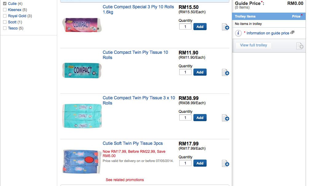 2.按”Shop Online. We Deliver”之后,你可以开始依据你要购买产品组别来选产品,产品都有依据牌子来分类,譬如说我们买厕纸习惯了买Cutie的品牌,可以直接按Cutie 品牌,然后可以看到不同的包装组别,如果有促销的话,还会注明“省下多少”。
