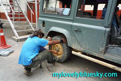 当我看到他们换轮胎的时候,他们已经把旧的轮胎拿出来了,到底旧的轮胎发生了什么事??我就不清楚,猜想是轮胎有破损吧!!
