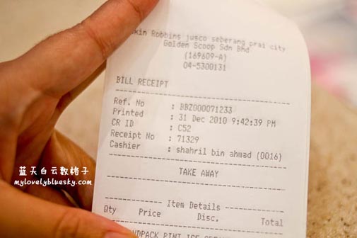拍下2010年12月31日最后一次的消费,那就是买下了Baskin Robbins冰淇淋。是不是最简单的方式庆祝一个节日到来?
