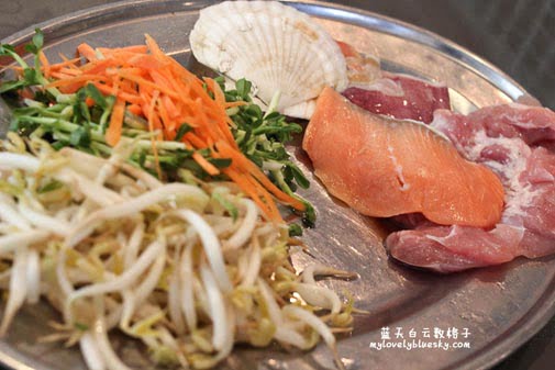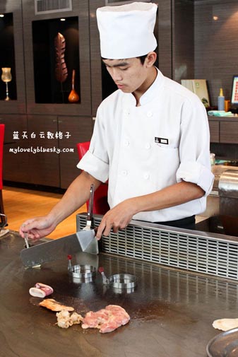 我们点了食物之后,厨师从厨房走出来了,拿着一盘食材,厨师也蛮好看又年轻!哈哈!!我拿着相机对他拍了几张。他的手法很熟练的在铁板上烹煮菜肴,权雄说他第一次坐在餐馆看铁板烧的呈献,我们两人一直在研究他们烹调手法。