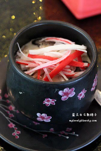 chawanmushi,中文名:茶碗蒸,chawanmushi内有很多材料,加上蒸得香滑,可以说是日本餐最常吃的!我们两人醉翁之意不在酒,而是看上了杯子的图案的美。