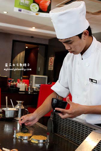权雄选择的Sakae Gozen的铁板烧干贝和和三文鱼并没有由我们眼前的厨师Jack 烹煮,而是直接从厨房里拿出来了,我们看了有点小小失望,怎么不是没一样的铁板烧料理都在眼前准备的?权雄大赞铁板烧干贝好好吃!