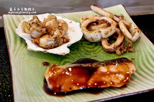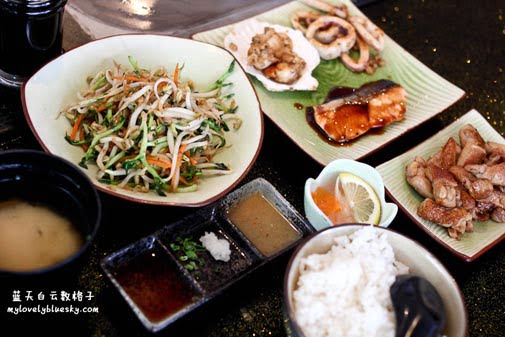 而我点了Geisha Set,价钱是RM32.90,套餐里有铁板烧鸡,墨鱼,Half Shell Scallop和三文鱼,Miso Soup,还有炒菜。看到这份套餐的分量,你们想像到我能吃完,你们是不是替我担心?不肥才假!哈哈!!对我来说,价钱和分量都是合理的,可能我一直故意把这里的价钱和过去在吉隆坡吃的铁板烧作比较。