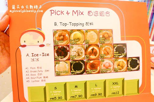 我们可以选择店主已经搭配好的冰冰和配料的组合,也可以自己作主选择冰冰和配料的组合。如果自己作主选择配料的话,冰冰的价钱就以配料的数量来计算,譬如: