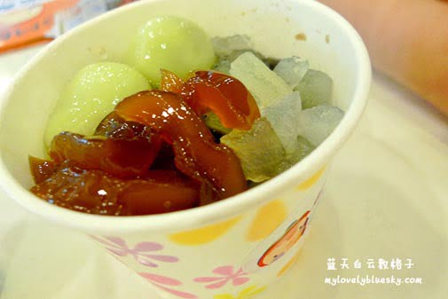 服务生把做错的冰冰拿回去厨房之后,他们想要赠送QQ ball,直接在之前做错的冰冰里增添了海底椰,换句话说我们给S size (2 toppings) 的价钱可是享受M size (3 toppings) 。Serinajr选择了荔枝口味,他说有着比较重的甜味。Serinajr分我吃一粒QQ ball,弹性!