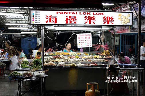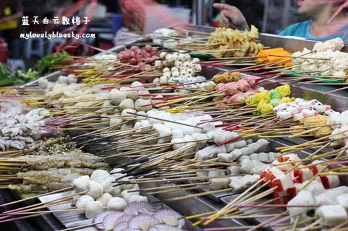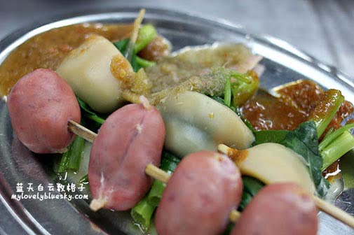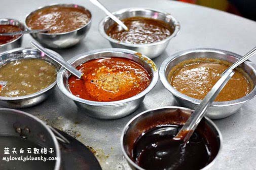 话说起来,才能园贪吃街的经营方式和马六甲的Satay Celup一样。可是酱料呈现方式就不一样了。马六甲的Satay celup把酱料放在锅里,而海边乐乐准备了7碗酱料放在桌面上,有甜酱、蒜米辣椒酱、satay酱、laksa酱、辣椒酱等等(其中2碗不知名的酱料),我们把烫熟的串串乐乐放在盘子,淋上酱料。