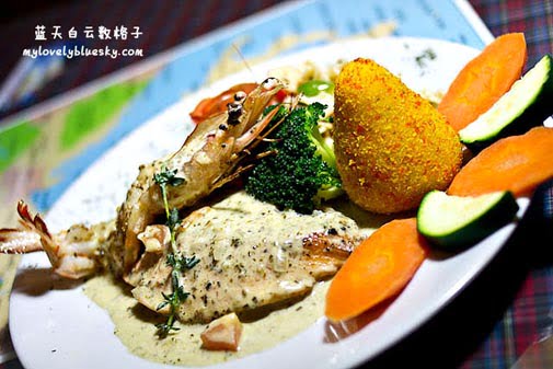 我们很幸运有机会尝试到尚未推出新市场的菜肴,对我来说这一盘的摆设很有吸引力。其实大部分食物的摆设可以和酒店的西餐有得媲美。酱汁带出虾的鲜甜,好好吃!!尤其是那个炸马铃薯,内有夹着cheese,cheese溶在口里,对我来说一点也不油腻。