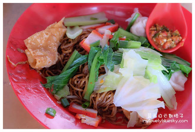 主角云吞面?在这里云吞面看起来是配角了。云吞面,小的,价钱RM3。怎么他有黑黑的叉烧没有用在云吞面呢?(下次我去吃,要问他了)每一盘云吞面上桌,都有一个汤匙的叁峇(Sambal),这一个叁峇对他来说是不辣的叁峇,问题是妈妈搅拌一点点在面条,妈妈已经投诉到呱呱叫,辣到肚子感觉到“辣”。而我变成很保守,不敢一汤匙的叁峇来搅拌,就是沾一点点来吃,我也感觉到叁峇辣到不得了,眼泪都急迫出来了。