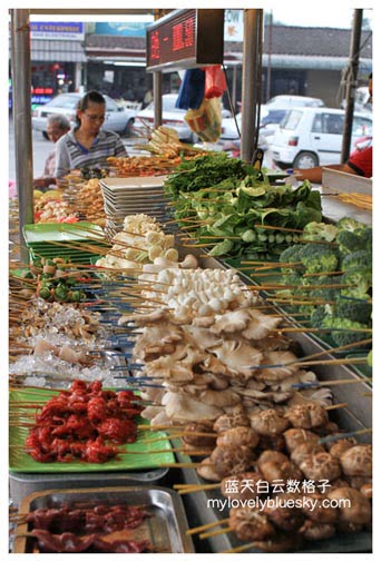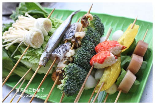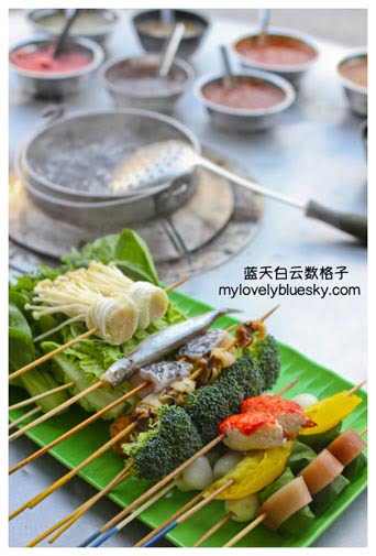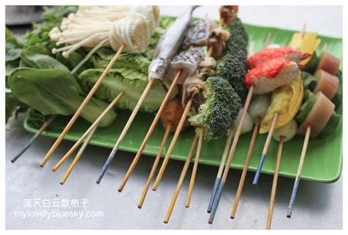 一般上,把蔬菜、海鲜或者肉类串起来,然后一串串放进热锅里烫煮,串串食物熟了,沾上酱汁,吃进嘴里。通常吃乐乐多数都在路边摊。