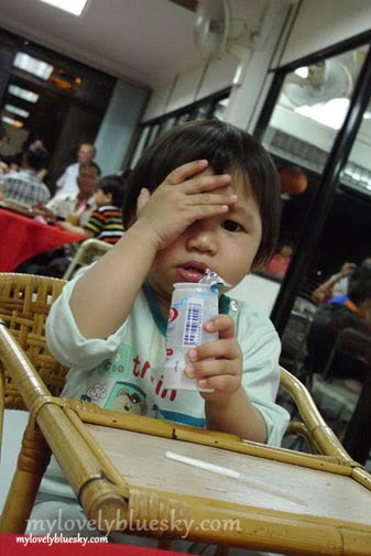 今天我们一走进来,看到这间店爆满了,好不容易找到一个位子。服务生说要等候45分钟食物才上桌。看来很多人都趁开斋节长假回乡和家人团聚。虽然要等候这样久,我们也没有打算更换其它地点,相信其它地方也少不了等候。只好在这里等候。等候是不是很闷?不会闷,因为权雄的侄女(二哥的女儿)在场表演一番,让我们笑个不停。
