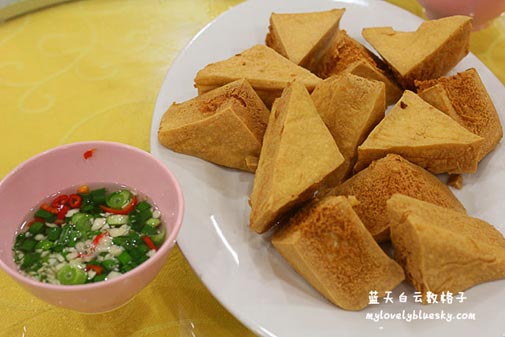 潮州豆腐,这是该店的特别豆腐。在大山脚有2家餐馆可以吃到潮州豆腐,一家就是辉煌海鲜饭店,另一家就是辉记海鲜火锅专卖店。炸得香酥的豆腐沾在调味汁,该碗的调味汁内有着重重的蒜米和青葱味道,少许的切块辣椒。整体吃起来很特别的口感。