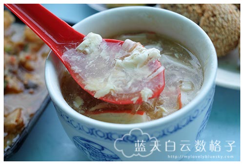 在某个部落看到了推荐了他们的鱼翅,可以看到这鱼翅没有真蟹肉,而是用蟹柳,心想蟹柳的话就适合皮肤敏感海鲜的权雄吃。可是当我们吃了之后,味道淡而无味,需要加醋、酱油和辣椒搅拌下去,而他吃到碗底的时候,吃到有真蟹肉在内,嘴唇就敏感起来了。