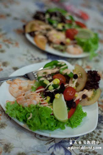 Supreme Prawan Salad,每一盘里有2只中型的虾、灯笼椒、番茄、玉米、葡萄干、生菜等等。挤出柠檬汁在沙拉上,味道不错吃。我赚到一点点,一个人可以吃4只虾,因为权雄对虾有敏感,他把虾都了我吃。呵呵。