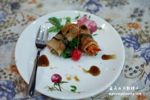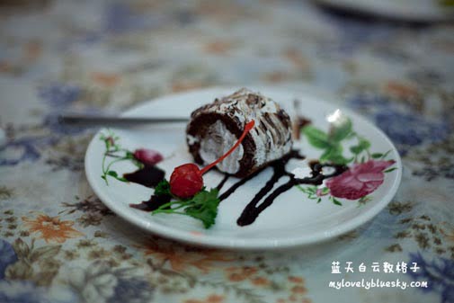 甜品是巧克力蛋糕卷,我说一整晚最好吃的食物就是这个蛋糕卷了。呵呵!人病了,口味也怪怪了,竟然说甜品最好吃!哈哈!!晕!
