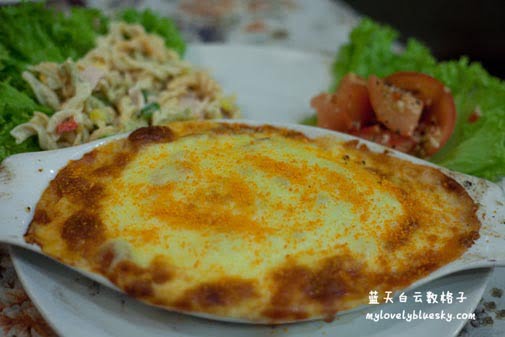Chicken cheese baked 套餐, 价钱RM38 。如果单看menu上的名称“Chicken cheese baked ”,我们以为芝士烘鸡肉,可是权雄打开盘子上的芝士,里面有意大利面粉!呵呵!我们还以为点错,多次和服务生确认了,他们说这就是Chicken cheese baked。吃完这一份,对权雄来说超级饱了。