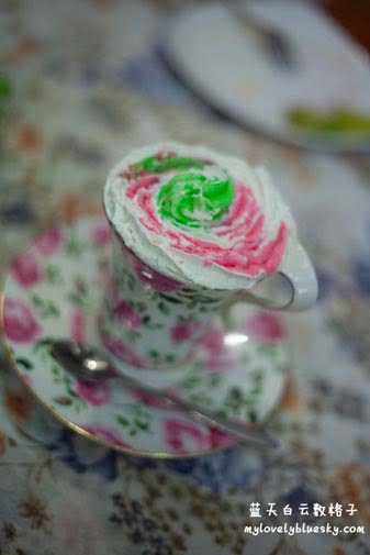 Cappucino,权雄的饮料,花杯子上的cream添加了红绿的色素,配合圣诞节主题,可是我却感觉到很怪咯,好像是印度人的饮料色素。呵呵。