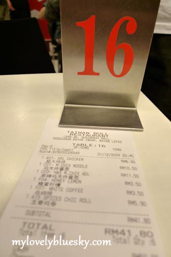 我们两人看着七彩的menu,已经被诱惑了。我们做好了决定之后,权雄把选择写在一张纸,然后权雄走到柜台点食物和先付钱,同时服务生给他一个号码牌子, 较后服务生就会根据号码牌子把食物送上来了。留意看看收据,你可以发现到台湾公牛没有征收15%服务税政府税。