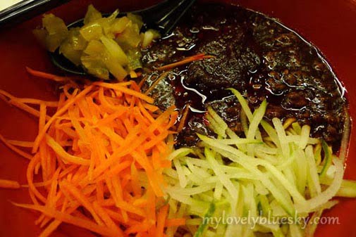 鸡肉炸酱面还没有来之前,权雄偷偷告诉我鸡肉炸酱面有加咸菜碎,那些咸菜碎我爱吃,说不定我吃了开胃。我们可以看到鸡肉炸酱面的卖相很吸引人,有黄瓜,萝卜丝,咸菜碎和鸡肉酱,把这些材料和面条搅拌了之后,面条吃起来爽口,我爱吃,味道也适合我。