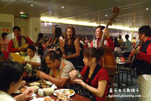 当我抵达名厨的时候,人潮算是蛮多。怎么刚才不察觉这样多人上邮轮的??在名厨里,就可以感觉到多少游客在邮轮里。乐队来到一些游客附近唱歌伴舞。他们唱出一些经典歌曲。这就是名厨给我的第一个气氛印象了。较后,服务生也来一场热舞表演!!