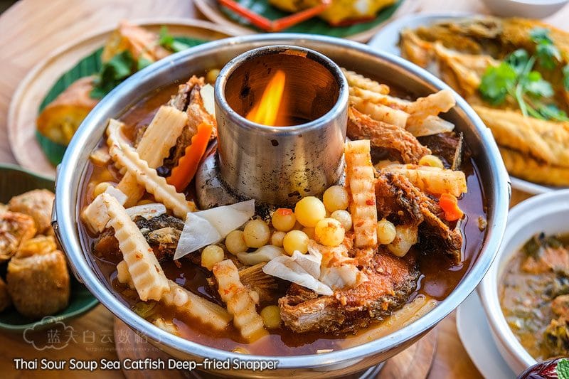 左:Thai Sour Sea Catfish deep fried Snapper – 除了泰国冬炎汤,推荐你们尝试泰国酸辣海鲜汤,鱼肉经过热油炸之后再放入火锅里煮,吃起来汤汁较为偏咸,配饭最好。