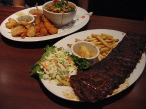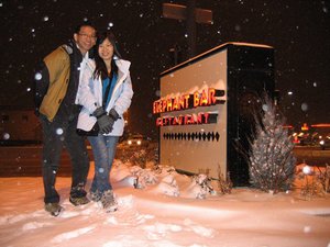 肚子是饿了,权雄带我出外吃大餐。 来到这里之后,很少出外吃,这里每一种的食物对我来说都是一种新鲜的产品。我们来到一间名叫ElephantBarRestaurant的餐厅。里面是不 是有大象,对了!还有,豹,长颈鹿, 老虎其他动物,都是塑像而已,别怕。灯光和情调蛮不错,服务也不错,一直很关心问候你有任何需要。权雄告诉我:大多数的顾客会给10-15% 的服务税给服务生若你很满意他们的服务。我们点了一盘的猪骨排和虾拼盘。食物分量也蛮大,可能肚子太饿了,我们把食物扫光了,好好吃, 服务生你有被吓到吗?。尤其是猪骨很香甜, 我们都很好奇地想厨师如何烘烤猪骨,骨肉轻易且可分离,肉不粘骨。雪从早上到晚上还是不停的下, 积雪已经有4-5寸高了。