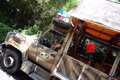 我个人认为Animal Kingdom会这样大的原因是有个野生动物园,如果叫我们以步行来走野生动物园,我看我一点会喊脚酸,还有被野生动物吃掉了!!当局安排了一辆能载满32个人的卡车,加上专业训练的司机,他们带我们一起进入了非洲野生动物园。