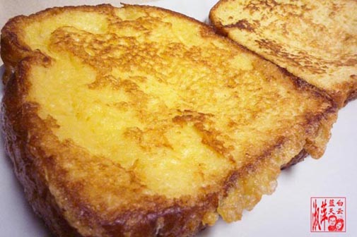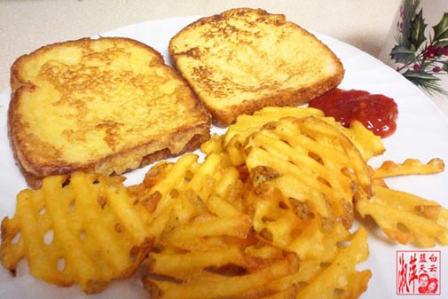 名堂是爱心早餐,到底有什么?煎蛋面包,就是把面包沾上搅合的鸡蛋,放在平底锅里煎。再来一个烘薯片(其实不知道这种马铃薯切法应该叫薯条还是薯片?),不要误会一件事,不是我切的,是买现成的,只要放进去烘炉20分钟就可以完成。