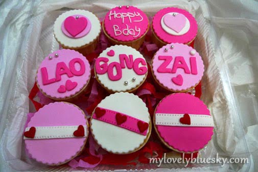 我看到了Birthday Cup Cake之后,比他更开心,因为我很喜欢(好像我是主角)。我点了9个Birthday Cup Cake,要求在Birthday Cup Cake上面写Happy Birthday, Lao Gong Zai,其他的设计都是以My SweetHeart系列为主体。